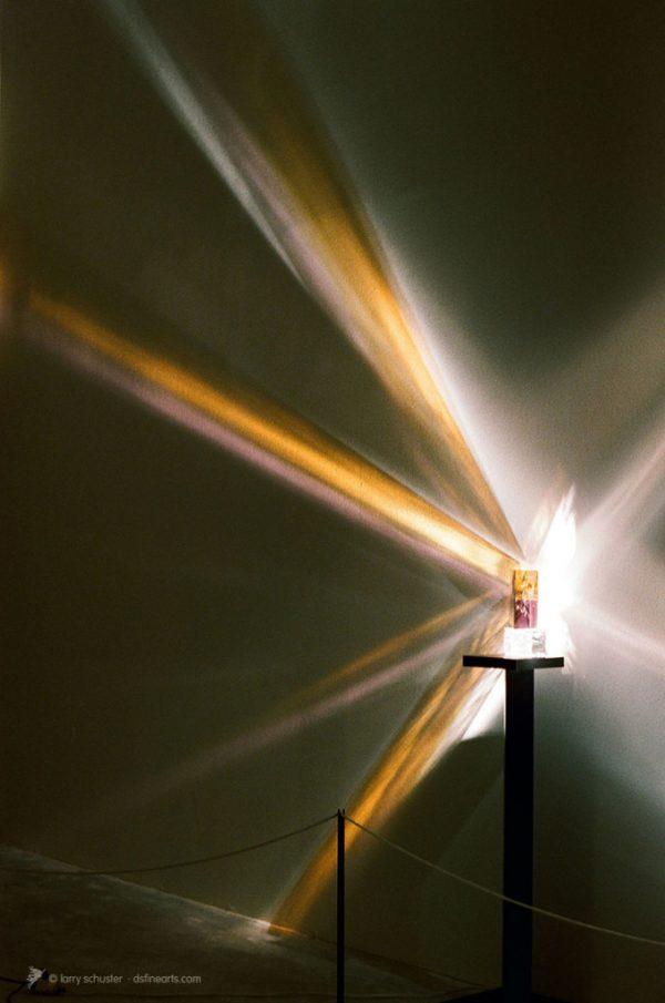 “My idea with this piece of modern art sculpture was to create an otherworldly, translucent chamber. By using gold glass on top and purple glass on the bottom of this rectangular prism, it gives the impression that the chamber is filled with two different extraterrestrial planetary gasses. Inside this alien atmosphere is a strange life form, that is also somewhat familiar. Use of lighting and projection gives this piece further dimension and scale.”