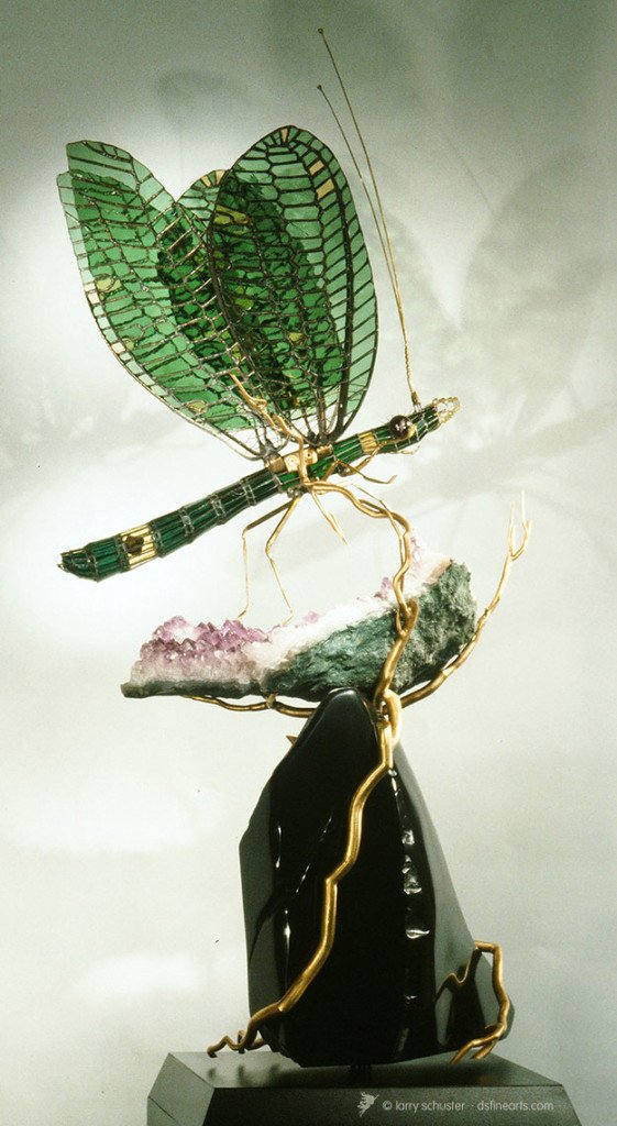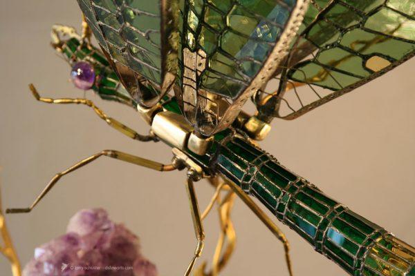 “The body had to be stylized and I couldn’t be as accurate with the wings. I had to bevel each piece of glass in the body so that it would conform to the cylindrical shape. It was incredibly time consuming. I used an antique opticians grinding wheel, originally used to grind lenses for glasses. The eyes are amethyst and there is amethyst in the interior as well. The fine wire shapes inside the body give you the impression of the stylized internal workings of the insect. The interplay with lighting is essential to the piece, giving it greater scale, and form, taking it out of the usual three dimensions.”